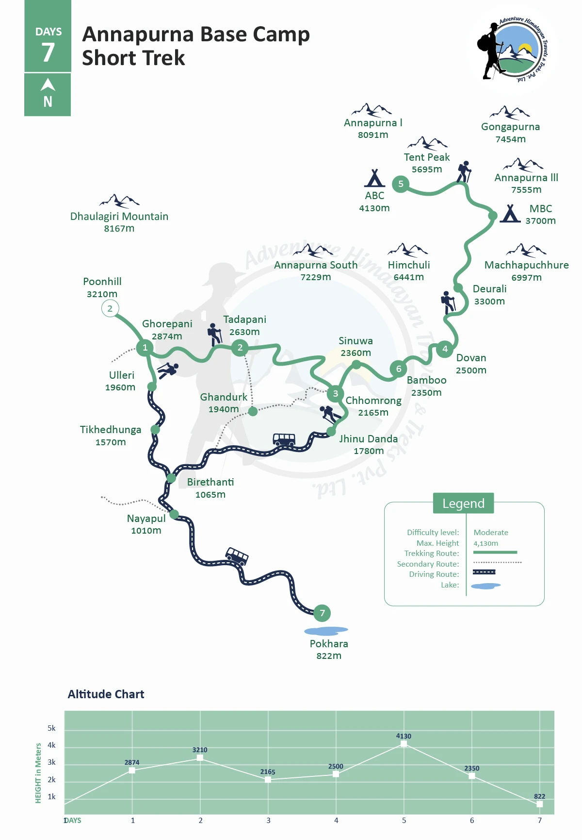The 7-day Annapurna Base Camp Short Trekking is from Pokhara. It begins with a drive to Ulleri, which then treks through the villages of Ghorepani, Tadapani, Chhomrong, Dovan, and Deurali, finally to the Annapurna Base Camp on the 5th day. On the way from Ghorepani, you will take a side trip to Poon Hill, meaning that you will not miss out on any of the major highlights of the Annapurna Himalayas. By the 6th day, the descending trail begins and at first stops by Bamboo on the very next day, trekking to Jhinu Danda and driving back to Pokhara on the same day.