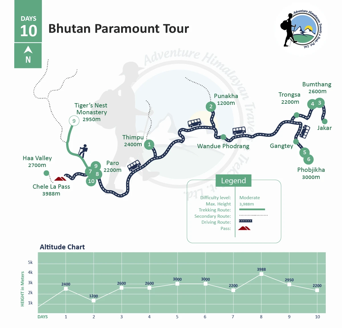 Bhutan Paramount Tour is one of the popular cultural and natural heritage sightseeing journeys, which is designed for an in-depth view into the ancient way of life, rich culture, and nature that still thrives in Bhutan. The 10-day Bhutan Paramount Tour itinerary from Adventure Himalayan Travels and Treks is designed to allow you to explore all the major highlights of the Himalayan Kingdom of Bhutan.